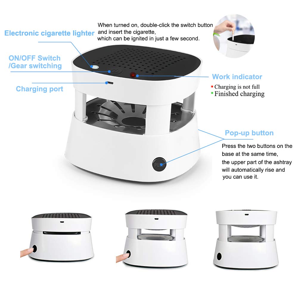 The electronic ashtray has a pop-up button: press the two buttons on the base at the same time, the upper part of the ashtray will automatically rise and use. High Quality: Flame Retardant Plastic Frame; High Strength Aluminum Alloy Housing; High-speed grinding edge, smooth and not easy to cut hands.Easy to disassemble and easy to clean. The metal part can be directly taken.