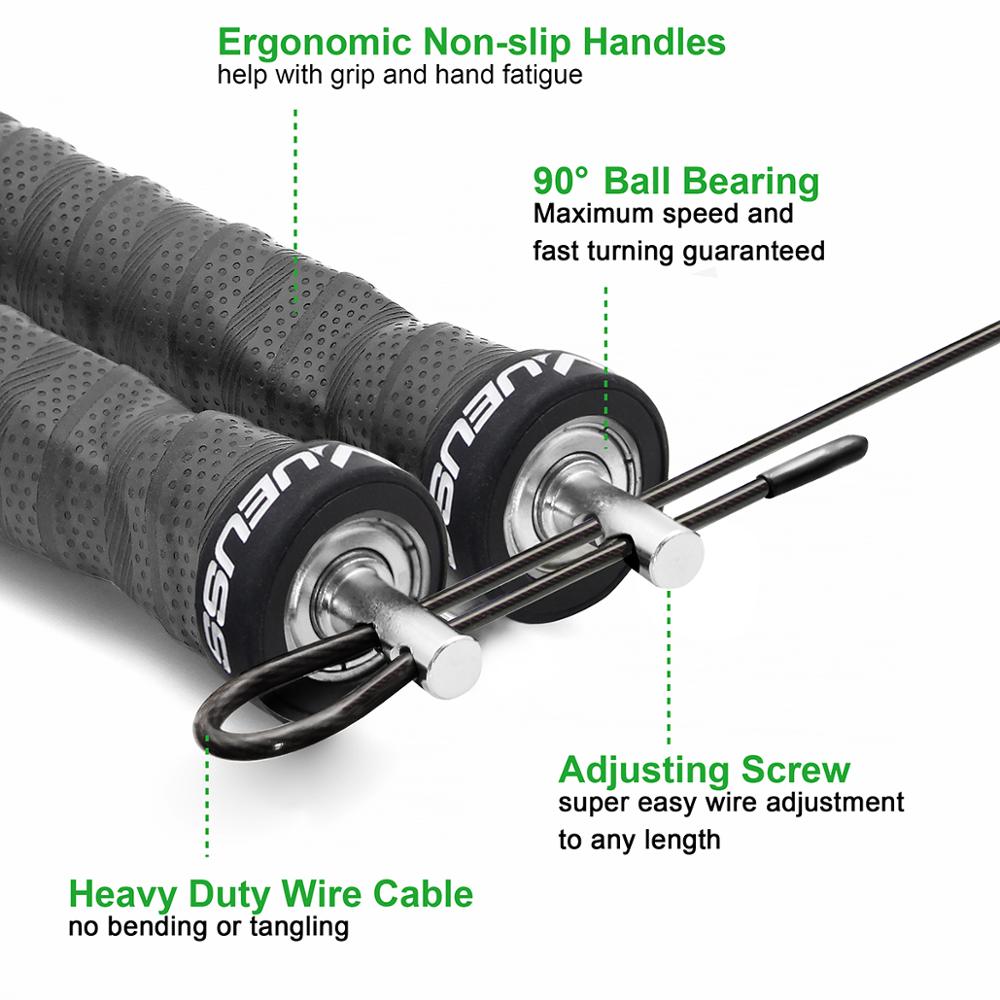 “We know how fast the day goes, so we understand that the precious time spent working out should be a positive and hassle free experience.” WEMADE Official Store is a dynamic and creative team,we have technicians who have been working on fitness products for many years and factories specializing in the production of fitness equipment and supplies.MUEUSS seeks to help individuals reach their peak fitness goals by providing quality manufactured fitness gear that will better optimize their workout and achieve a higher quality of living. Description: The Skipping Jump Rope is unique with its ability to easily change lengths and non-slip sweatband tape . Each rope comes with PVC cable, easy to adjust the length of the cable. This Steel Wire Skipping Jump Rope has been the choice among competitive athletes in the sport of jump rope. It is unbelievably fast! What you can get: - High Speed Enjoy every jump you make! Built-in double ball bearing design ensures its rotation power and the flexibility of movement, not only increases the speed but also creates a very stable rope swing so you can easily recover from inaccurate swings - Handles With Sweatband Tape Non-slip material which makes grip feel natural and comfortable. And sweatband tape allows you to hold your rope without worrying about it slipping - Adjustable weight (Handles) Come on ,increase the intensity of your exercise! You can make the jump rope heavier by adding some sand into the jump rope handles - Easy Adjustable Length Everything goes easy, 3m jump rope which fitted with extra-large screws and easy to adjust the cable length, suitable for all ages - Portable Size Great size allows you to carry it go to any gym or put into the personal bag. Perfect for home gym and outdoor workouts. It's a workout tool for anyone travelling, or anyone who spends a lot of time on the road. Specifications: - Material: PP + sweatband tape (handle) steel + PVC (wire) - Rope length: r - Handle length: 135mm Package weight: 0.192 kg Package Size(L x W x H): 17.00 x 11.00 x 4.00 cm / 6.69 x 4.33 x 1.57 inches Package Contents: 1 x Rope, 1 x Bag