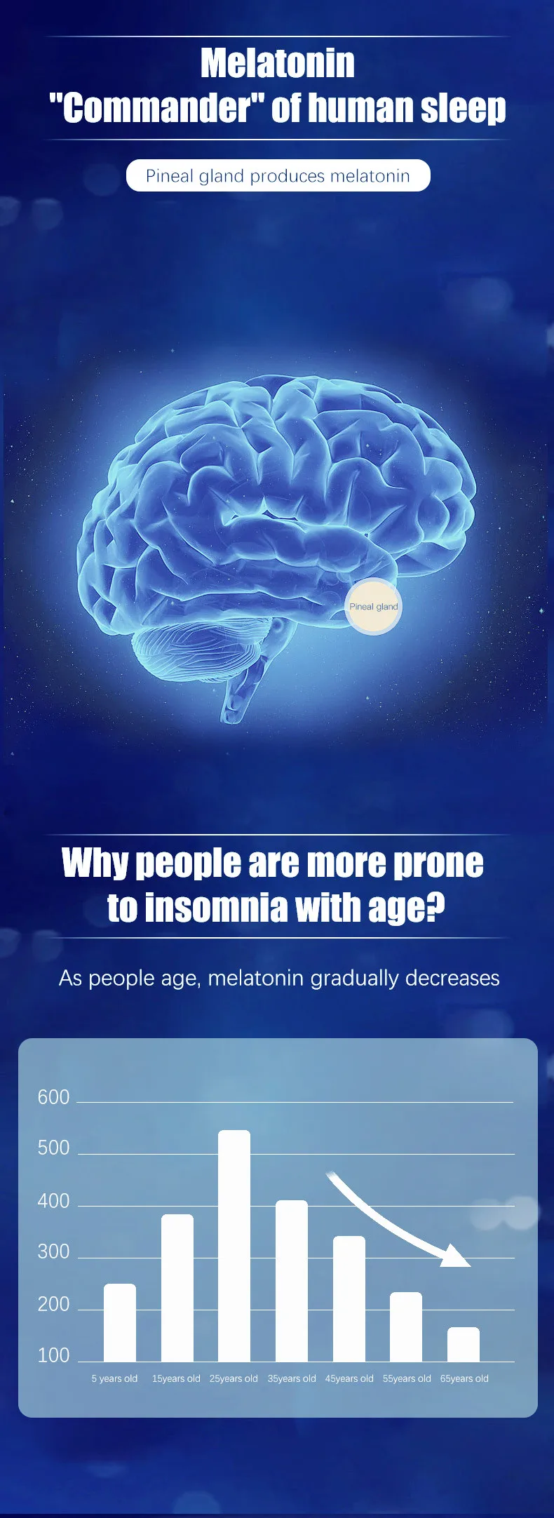 Melatonin (outside the pineal gland element) : is the body the pineal gland in the brain releases substances. Studies have shown that melatonin controls the body's biological clock, with the increase of age, the body of melatonin year by year reduce,thus appears a series ofaging symptom such as insomnia, much dream, forgetfulness.