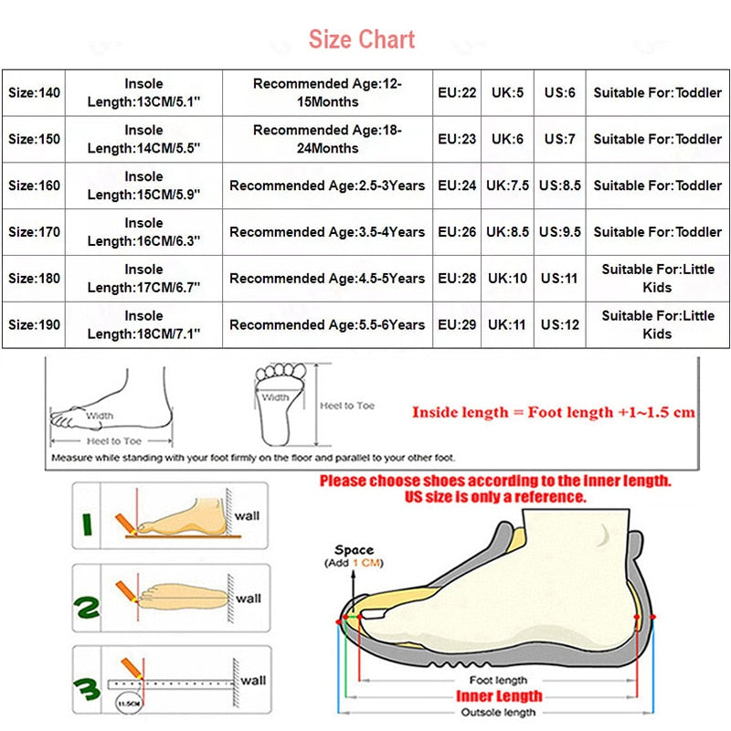 Choose perfect shoes size for your children, our shoes measure by hand, So There will be 0.1-0.3 cm error.